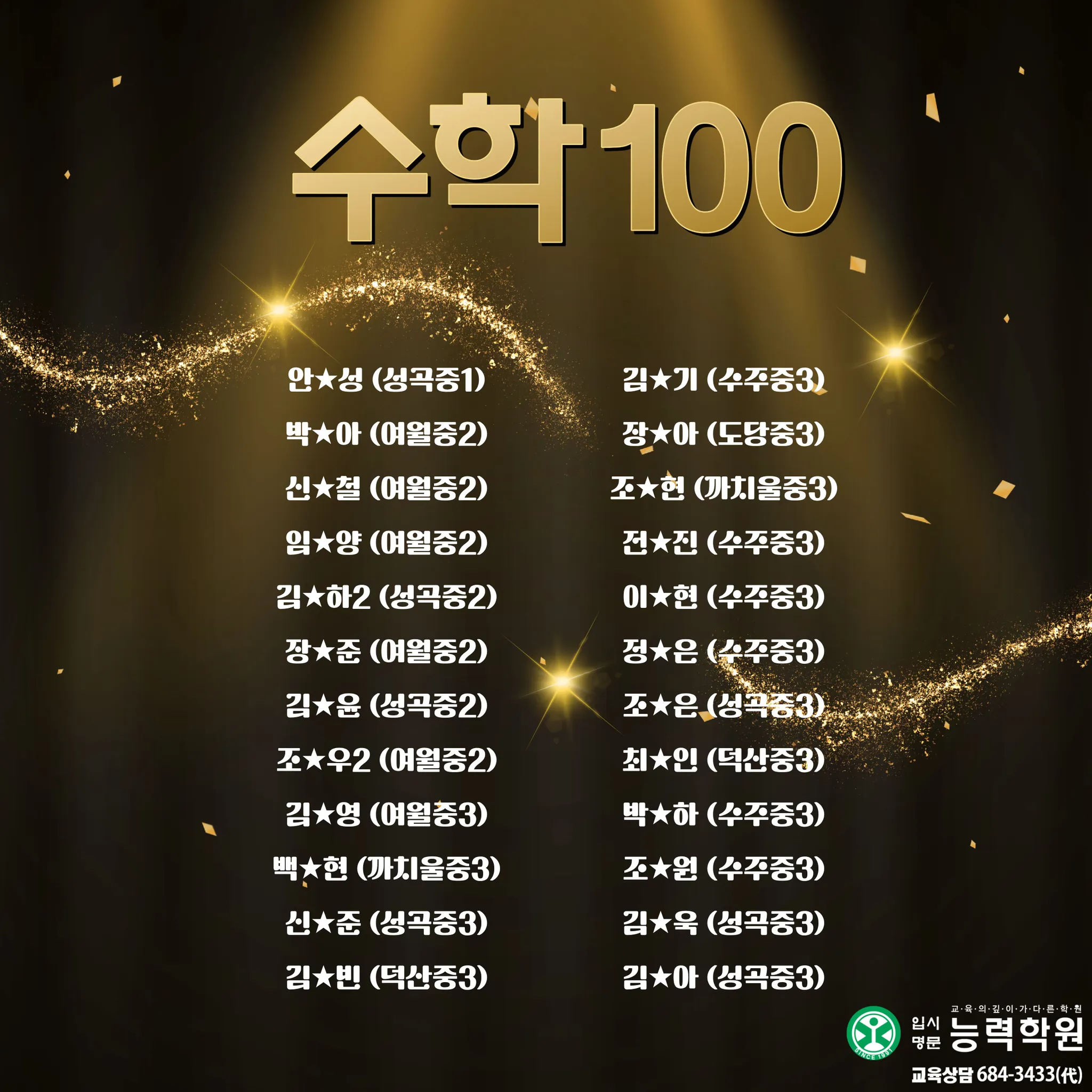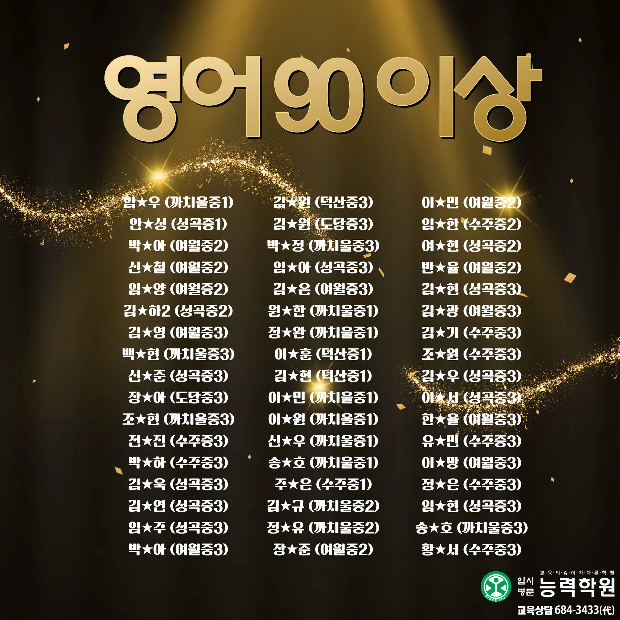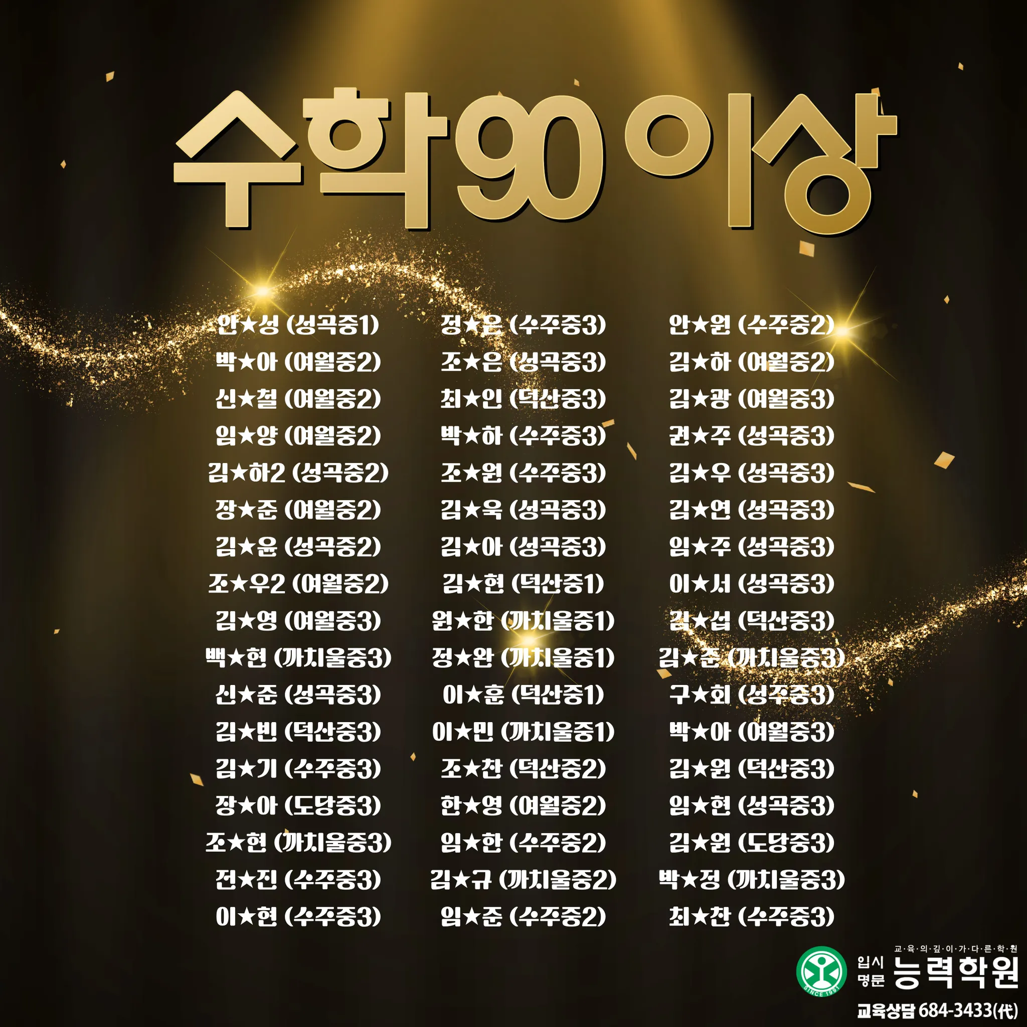 능력학원 중등부에서 2025년 2학기 중등부 실적을 공개합니다. 능력학원은 학년별 전임 선생님과 과목별 전임 선생님이 함께 설계한 관리 시스템으로, 내신의 흐름을 “진도-개념-문풀-오답-서술형-시험 운영”까지 끊김 없이 연결해 학생을 끝까지 끌어올립니다. 여기에 고등관 출신 영어·수학·과학 전임 선생님의 고등 연계 지도까지 더해져, 중등 내신에서 끝나는 학습이 아니라 고입 이후에도 흔들리지 않는 실력의 뼈대를 완성합니다.이번 중등부 기말고사에서도 성적 결과로 증명했습니다. 단순한 문제풀이가 아니라, 시험 범위 분석과 출제 포인트 예측, 취약 단원 집중 보완, 서술형 문장 구조 훈련, 시간 배분까지 실제 시험처럼 훈련하며 최상의 컨디션으로 시험장에 들어가도록 만들었습니다. 그 결과, 중등부 기말고사에서 상위권 성적이 대거 배출되며 “관리형 학원”이 아니라 “결과로 말하는 학원”임을 다시 확인했습니다. 그리고 능력학원의 경쟁력은 중등부에서 끝나지 않습니다. 대입에서도 압도적인 실적으로 오정구 1위를 기록했습니다. 서울대 1명, 연세대 3명, 고려대 2명, 서강대 3명, 성균관대 3명, 한양대 5명 합격이라는 결과는 우연이 아니라, 내신과 수능을 분리하지 않고 장기 로드맵으로 설계해온 능력학원 시스템의 증거입니다. 중등부터 고등, 그리고 대입까지 ‘한 번에’ 연결되는 학습 설계와 밀착 관리로, 학생의 성적과 진학을 끝까지 책임지겠습니다.초등에서 대입까지 All in One!