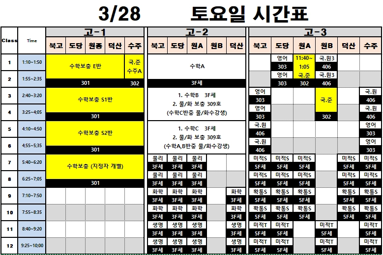 시험대비동안은 보충수업추가로 특히 시간표 수정 업데이트가 잦습니다. 매일 시간표 확인바랍니다.